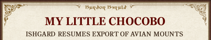 Avian lovers now have reason to rejoice, however, for some days ago it was announced that Ishgard will once more supply the other city-states with mounts. The move has raised many a smile upon the faces of rental stable operators, but much more is at stake than the prosperity of local businesses. The resumption of imports was made possible only through the joint effort of the Grand Companies of Eorzea, who impressed upon the Ishgardians the vital nature of fleet-footed reconnaissance units in dealing with the Garlean threat. So it was that the isolated mountain nation relented and agreed to provide all three Grand Companies with birds—but not without conditions. Reluctant to relinquish their monopoly on chocobo breeding, the Holy See will permit naught but male birds to leave its domain. In response, the other nations have raised their voices in objection, and are seeking to overturn what they deem a profit-driven decision in the midst of wartime.
