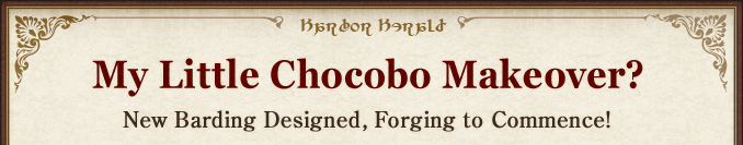 From what I have heard, the barding is ingeniously devised so as to protect the vital areas of the body and head, yet without hindering the speed or movements of the chocobo. Moreover, there are slated to be a variety of forms to appeal to as wide an aesthetic range as possible. It would seem we are finally drawing near the day when the heavily armored chocobo will at last be a reality—albeit one hundred years too late.